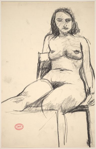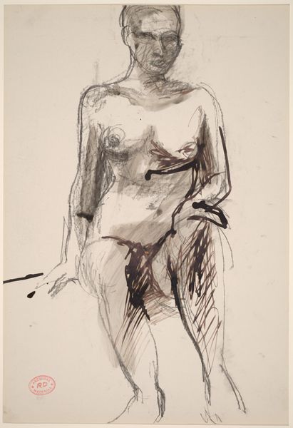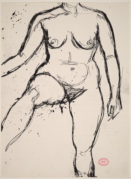 Curator: This ink drawing by Richard Diebenkorn, likely created between 1955 and 1967, presents an untitled nude figure. Editor: I'm struck by how immediate it feels. It's a portrait in motion, capturing not just a physical form but also a fleeting emotional state, maybe pensiveness or introspection? Curator: The symbolism of the nude, especially in Diebenkorn’s context, is interesting. While rooted in classical tradition, he distills it to something more intimate and modernist. There's a dialogue here between tradition and personal expression, wouldn’t you say? Editor: Absolutely. And I love how the lines aren’t precious; they’re searching, almost vulnerable. It avoids idealization and invites you into the artist's process of seeing and interpreting. It’s like he's showing us the mechanics of observation, not just the finished result. Curator: Yes, there is almost a tension in his gesture, between clarity and obscurity. Notice how he contrasts precise linework with areas of dense hatching to create shadow and volume. In certain regions the line fades altogether. That seems to be what creates such emotional weight. What does the obscured and absent line invoke for you? Editor: I feel like that is where the internal drama resides! The sketchy areas are like unanswered questions. It leaves me thinking about the vulnerability of existence and its mysteries, all those untold stories which Diebenkorn suggests exist right there on the surface. It gives her form depth but it gives the whole image… heart. Curator: Exactly, Diebenkorn has rendered the human form but also reveals an interior landscape. He captures both presence and absence within his portrait. It makes me consider how certain memories are also created and revealed. The incomplete rendering mirroring the fragmented ways in which we recollect things. Editor: That makes perfect sense, particularly because the composition itself feels intentionally incomplete, adding to that sensation that we’re privy to only a part of a larger narrative. He provides the audience a point of contemplation on an intimate scale. A special treat. Curator: Agreed, an opportunity to engage with an almost immediate and tactile vision into human feeling rendered through abstract figuration. Editor: Beautifully said. A vision indeed!