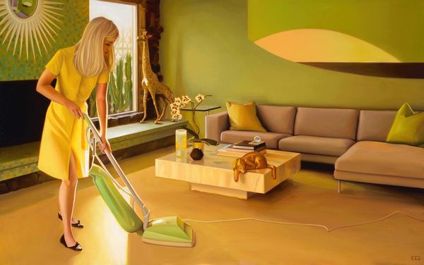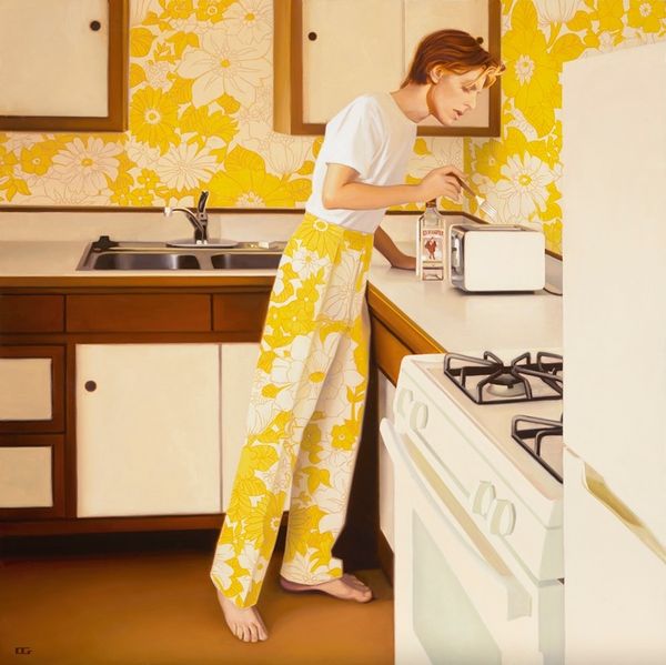 Carrie Graber painted "Citrus & Sunshine" in 1975. The overwhelming sense is one of warmth, achieved through a citrus-infused palette of yellows and greens that dominate the composition. Graber uses color not just as decoration, but as a structural component. Notice how the light filters through the window, creating a play of shadows that sculpt the space. The woman, positioned centrally, acts as a vertical anchor, her white dress a stark contrast to the surrounding hues. Yet even she is bathed in the pervasive light, integrated into the chromatic scheme. The high-key color scheme and domestic subject matter nod to a certain Californian aesthetic. However, Graber is less concerned with mimesis and more interested in exploring the formal properties of color and light. This is not just a painting of a sun-drenched kitchen, it's a study in how color can define space, mood, and ultimately, our perception.