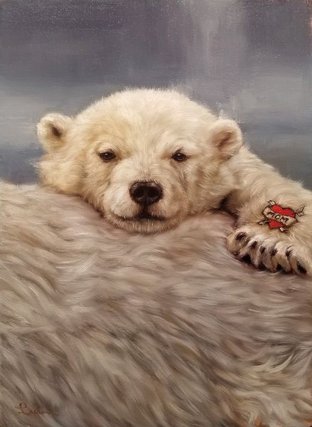 Curator: The palpable sense of tranquility is my first impression of "Mid Winter Dreams," by Lucia Heffernan, rendered in oil on what appears to be a square canvas. What draws your eye? Editor: I'm immediately struck by how the artist uses the medium itself to emphasize the texture of the polar bears' fur. The very process of layering the paint creates this soft, tactile feel that you just want to reach out and touch. I’m curious about the way oil paint is being used here, emulating a soft texture. Curator: It's an interesting use of traditional painting, particularly when viewed through a contemporary lens. The presentation prompts the viewer to consider our relationship to these vulnerable animals, which have become such potent symbols of climate change within museum settings. The institution plays a role in contextualizing the work within broader discussions about environmental awareness. Editor: Exactly! And think about the labor involved in creating this kind of realism, versus the ease of, say, digitally generating a similar image. There's a conscious choice here, perhaps a commentary on slowing down, appreciating the handmade, while depicting creatures vulnerable to a sped-up world of mass production and mass consumption. Curator: The simple, clear background certainly underscores this emphasis on the individual. I'm thinking about the tradition of animal portraiture and its ties to social status and power, even a long association with royal and wealthy collectors who displayed such works as trophies of sorts. But now the polar bear becomes an icon for survival, perhaps. Editor: And survival relies heavily on the tangible realities: the availability of resources, the conditions of their environment, the very stuff of their existence. Looking closely, it’s worth asking, too, about the origin and processing of the paint used here. What pigments, what binders contribute to its unique effect? The choice of these materials speaks volumes, if we listen. Curator: Absolutely. Considering that intersection of material reality and symbolic weight changes how we might see such works in art institutions—beyond purely aesthetic appreciation, toward something far more urgent. Editor: I agree. Thinking through process and history, our understanding of this initially serene scene can reflect anxieties surrounding the production of art and how human activities endanger these beautiful animals. Curator: Yes, by looking carefully, one sees it can reveal layers beyond a simple depiction of warmth, closeness and beauty. Editor: Indeed.