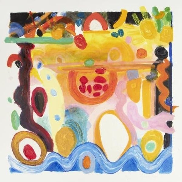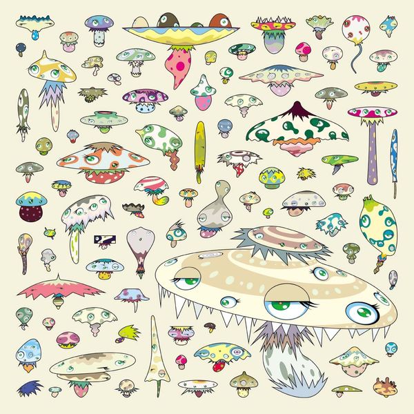 Curator: Takashi Murakami's 2004 painting, "Making a U-Turn, the Lost Child Finds his Way Home," presents us with a landscape populated by... are those sentient mushrooms? Editor: My initial impression is "fantastical and unsettling." The overall effect is like entering a dreamscape where familiar forms take on slightly sinister or bizarre qualities. Curator: That tracks with Murakami’s broader project. These aren’t your standard fairytale fungi; they're loaded with cultural and psychological symbolism. Mushrooms, throughout history, have been associated with transformation, the subconscious, even the dangerous allure of altered states. What do you make of their cartoonish features, the bulging eyes on their caps? Editor: I read it as a commentary on hyper-commercialized cuteness in contemporary culture, especially in Japan. The forced smile of that massive head hovering above everything – it's creepy! Underneath the playful Pop Art aesthetic, is Murakami critiquing the pressures on youth and the commodification of innocence? Curator: It's hard to ignore the historical context. Consider Japan's post-war economic boom, followed by periods of recession and societal anxiety. The artist emerged from this very specific socio-political landscape. His embrace of flattened perspective and vivid, almost acidic colors might also reference traditional Japanese art. He’s turning high art into a commercially viable brand, really forcing a confrontation of values. Editor: Do you think the seemingly innocent figures, the mushroom and child forms, echo past trauma and collective fears around nuclear fallout? Curator: Absolutely. This work operates on multiple levels. There's the immediate pop aesthetic, yes. But then you delve into the darker undercurrents – the anxiety, the fear, perhaps even a yearning for simpler times lost in a rapidly changing world. He uses an iconography familiar from mass media to explore societal anxieties about economic instability, globalization, and even cultural identity. Editor: What a fascinating blend of cultural commentary and personal expression. This piece shows how Pop Art can evolve into potent, relevant statements about who we are, or perhaps who we fear becoming. Curator: A landscape that prompts us to examine both external societal pressures and our internal struggles, reflected back at us with playful but knowing eyes.