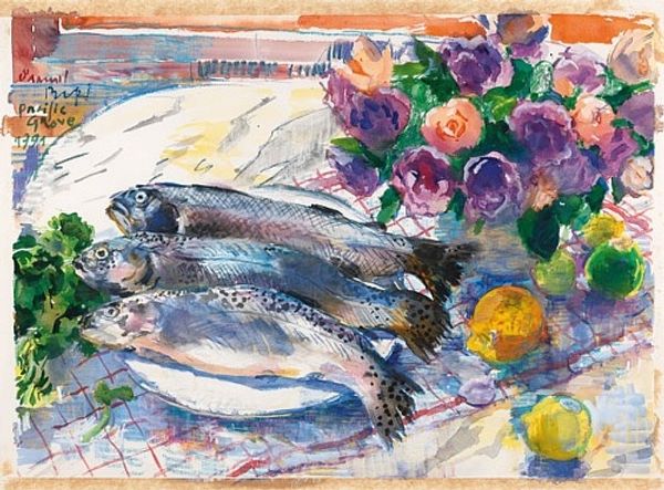 Pierre-Auguste Renoir's "Still Life with Pheasant and Partridge" presents us with a composition dominated by muted tones and soft brushwork. The arrangement, a classic display of game birds, is rendered with a palpable sense of texture. Notice how Renoir employs short, broken strokes to define the plumage, creating an almost tactile surface. The birds rest on a table draped with patterned cloth, its design adding a layer of visual complexity. Beyond its immediate aesthetic appeal, the painting engages with the semiotics of still life. Traditionally, such works served as displays of wealth and culinary prowess. However, Renoir's loose handling of form challenges these fixed meanings. The lack of sharp detail destabilizes the conventional reading, inviting us to consider the painting not just as a representation of objects but as an exploration of color and light. The subtle tonal variations and the delicate rendering of texture elevate the artwork beyond a mere depiction of fowl. Instead, it becomes a study in the interplay of form and perception, reflecting the Impressionist ethos of capturing the ephemeral qualities of the visible world.