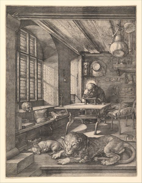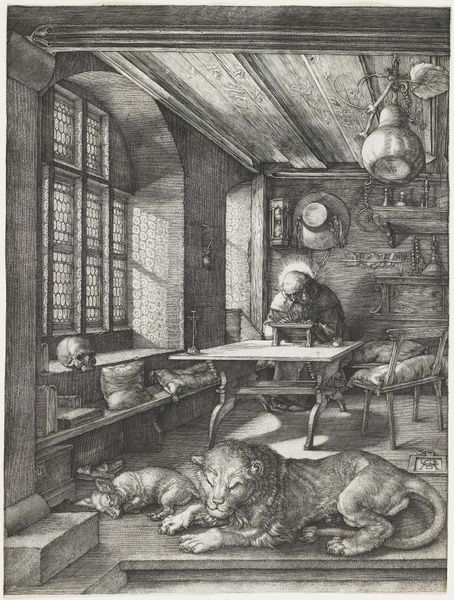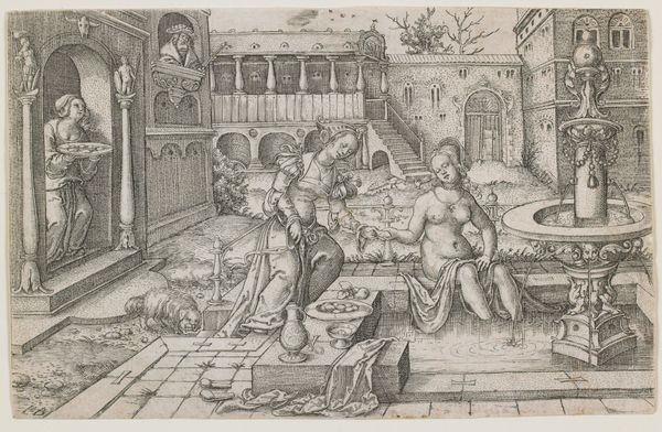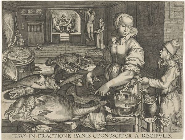 Curator: Here we have "Kitchen Scene with a Kitchen Maid Cleaning Fish," an engraving from 1603 by Jacob Matham. Editor: Wow, it’s intensely domestic, but also slightly…off-kilter? I mean, look at the sheer quantity of dead fish. It feels almost aggressive, a visceral statement on sustenance and, well, mortality. Curator: It’s important to consider the historical context. Genre scenes like this were becoming increasingly popular in the Northern Renaissance. They offered a glimpse into everyday life, but often carried deeper moral or social messages. Editor: You mean, it’s not just about a woman cleaning fish? Curator: Not entirely. Notice the details: the precisely rendered textures, the domestic objects arranged just so, even the paintings-within-the-painting in the background. They're all carefully placed and meant to tell a story, or perhaps, comment on contemporary values. Editor: Okay, I’m seeing it. So the abundance of seafood, the almost staged quality, maybe that reflects a society preoccupied with material wealth? A lobster as a symbol, not just lunch? Curator: Exactly. The imagery reflects an era where displaying prosperity was significant, and artistic choices had far greater socio-political undertones. The humble kitchen is transformed into a stage upon which those undertones come to life. Editor: It does feel performative, almost like the figures in the artwork on the back wall. This space contains little worlds inside it, no? And each character and fish occupies a different part of the stage. What to do with my time... I might meditate upon these layers. The whole print becomes almost theatric, even operatic in a strange, quiet way. Curator: A fruitful meditation, I'd say. Jacob Matham was a master engraver, renowned for his precision and his ability to capture these social subtleties within seemingly mundane settings. It showcases just how potent seemingly modest imagery can be. Editor: Looking at this piece, the layers and fish remind us of a fleeting nature and offer potent stories with precision in domestic scenery, a quiet moment for profound reflection.