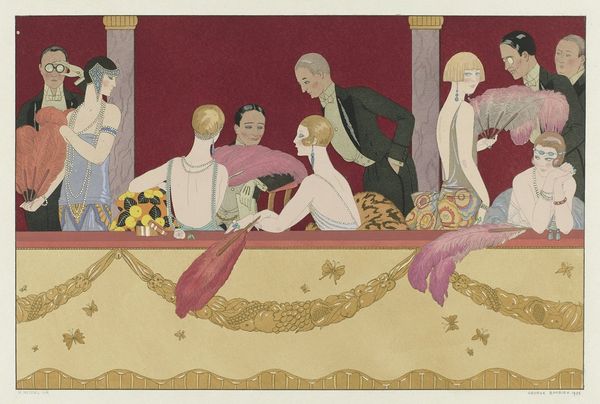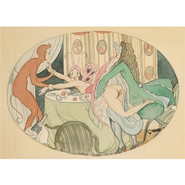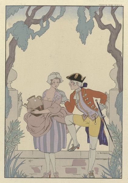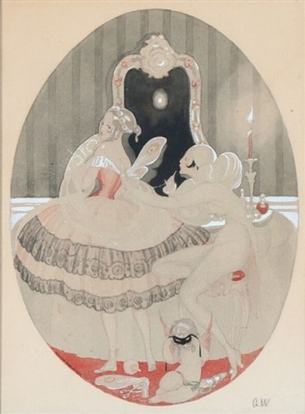 George Barbier made this illustration called "Le Matin," or "The Morning," sometime in the 1920s, probably with pen, ink, and watercolor, and what strikes me most is the color. It’s all pastels, pinks, and blues, with these sharp black accents, like the little dog and the man lurking in the background! The whole thing feels very deliberate, staged almost, with a boudoir scene, and the woman arranged just so. Look at the way the lines are so clean and precise, especially in the drapery and the bed frame. It’s like Barbier is showing off his technical skill, but also creating this dreamy, slightly absurd atmosphere. And that guy in the back… Is he a vampire? A disapproving father? The dark figure creates a tension that stops the piece from being simply pretty. It reminds me a little of Erté, another artist from the same period, but Barbier has this extra layer of playful weirdness. It's like he's saying, "Yes, this is beautiful, but don't take it too seriously."