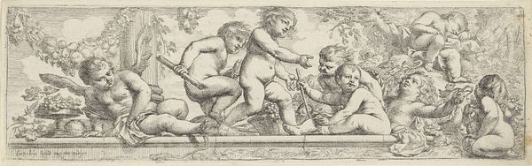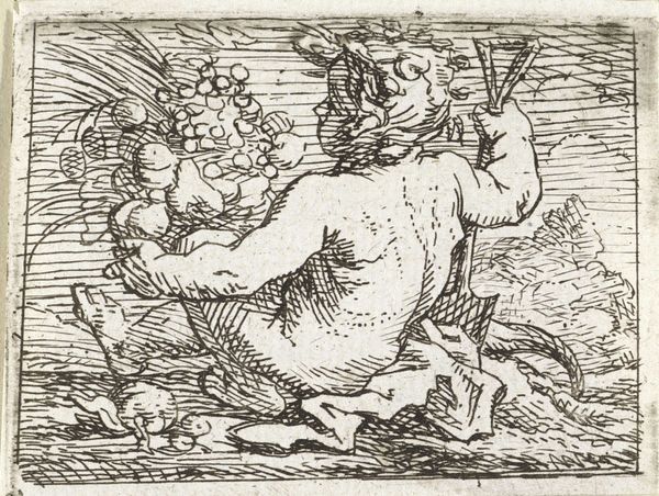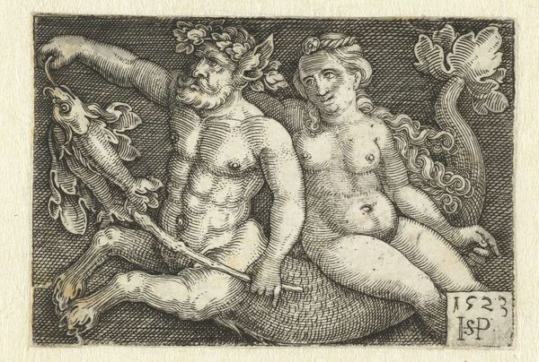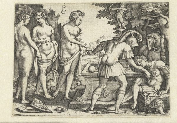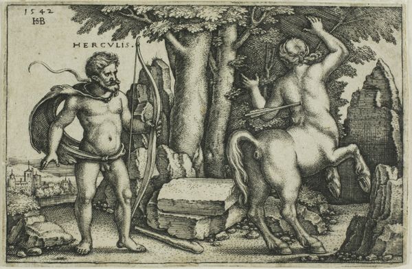 Editor: This is Sebald Beham's "Hercules and Nessus," a print from around 1542. The cross-hatching creates such a dramatic scene. What do you see in this piece, especially regarding its lasting impact? Curator: The arrow piercing Nessus is more than a physical wound. It represents the disruption of order, the shattering of established hierarchies. Beham masterfully captures the transition from a world governed by mythical beings to one dominated by human intellect and power. How might contemporary audiences interpret the centaur's demise? Editor: Perhaps as a symbol of the fading power of the old ways. I appreciate your focus on the symbolic transition—it really enriches the artwork’s narrative. Curator: Indeed. Remembering this allows us to understand the artwork as more than just an illustration, but as a potent reflection on the shift in cultural consciousness.