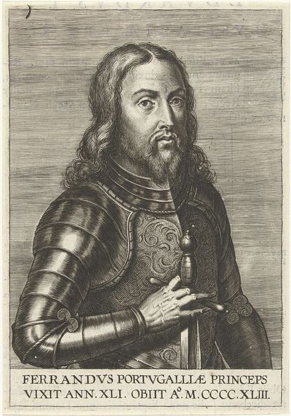 Curator: The visual weight in this engraving almost feels oppressive; the subject seems confined by the rigid lines and the density of detail. There is a sort of gravitas, almost somber authority, projected outwards. Editor: Here we have "Portret van Willem Lodewijk, graaf van Nassau-Dillenburg," rendered by Johannes Eillarts sometime between 1600 and 1650. It's a portrait, clearly, executed in metal, an engraving of the Baroque period. Curator: Absolutely, the engraving exemplifies a fascination with minute detail typical of the period. Look at the armor—it reflects not only the status of Willem Lodewijk but also his role as a military leader. And that lace collar, with its delicate yet strangely restrictive design… it speaks to constraints imposed upon him even amidst his power. Editor: Indeed, the armor operates as an important symbol of power and protection within the militaristic culture of the era, particularly during the Eighty Years' War. The choice of metal as a medium underscores this; metal has an inherently symbolic function denoting strength, resilience, and durability. Think of the Dutch struggle for independence and religious freedom – Willem Lodewijk was stadtholder of Friesland, Groningen, and Drenthe. He played a key military role. Curator: Note also the strategic placement of the helmet, a seemingly incidental detail. Its elaborate plumage can be interpreted not simply as adornment but as an indication of wealth and position—the ostentatious, confident display of worldly rank. It reinforces this image as one meticulously constructed for posterity. Editor: It's important, though, to critically consider that construction. These kinds of portraits served a specific ideological purpose; this is not an impartial, neutral rendering of an individual. How can we untangle the mythologizing impulses inherent in such state-sponsored portrayals? What image of power does this promote, and what political messages were conveyed to both domestic and foreign audiences through this depiction? What choices are made about his representation regarding his gender and social position? Curator: Fascinating questions to explore—questions that inevitably lead us to a deeper comprehension of the intricate dance between image and meaning, symbol and society. It demonstrates how historical memory is, often deliberately, cultivated. Editor: Exactly. Context helps to reveal a narrative of its own. Now that you see it, consider how such images function not just as art but as potent instruments of political and personal expression across time.