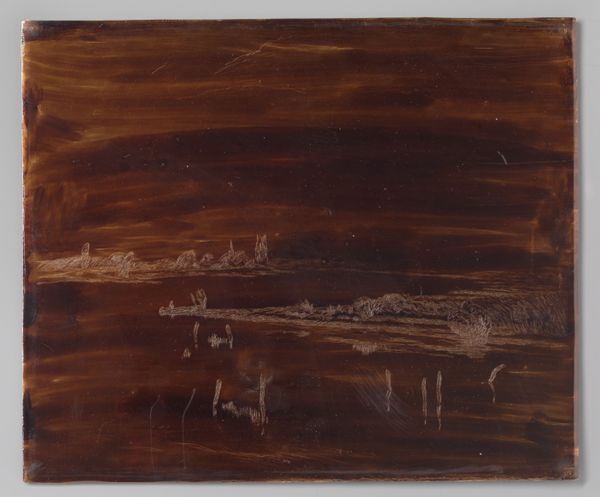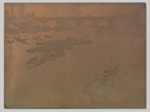 Curator: Here we have Willem Witsen's "Sleepboot voor Waterloo Bridge in Londen," or "Tugboat before Waterloo Bridge in London," painted around 1890. Editor: My initial impression is one of serene melancholy. The muted colors and veiled forms evoke a hazy, dreamlike atmosphere. Curator: Indeed. Witsen captures a London shaped by its industry and infrastructure, presenting a vision that's neither celebratory nor critical, but quietly observant. London in the late 19th century was the heart of the British empire and it underwent dramatic changes from the expansion of urban centres. Editor: Formally, it's fascinating how he's handled the watercolor medium. The washes are so subtle, creating a sense of depth and atmosphere with very economical means. Note, particularly, how he renders the bridge's arches as mere suggestions rather than fully delineated forms. The subdued earth tones lend themselves to a type of flatness while it somehow still suggests receding space. Curator: Waterloo Bridge itself had already undergone an important reconstruction around this time. You're correct, he evokes the arches with mere suggestions. The work focuses our attention instead to the boats below and on the city’s work-a-day river traffic, vital to the economic activity of London. This image offers a look at a metropolis powered by coal, factories and water transit. Editor: And that smokestack on the tugboat serves as a focal point—a vertical accent breaking the horizontal expanse of the bridge and the water. Curator: Witsen occupied a key position in the Dutch art world and associated with international circles of writers and painters like Walter Sickert. His connections fostered a cosmopolitan perspective, reflecting an era when artistic exchanges across countries flourished and allowed new perspectives to circulate more freely. Editor: It’s incredible how few distinct brushstrokes create this foggy, somber, urban experience. He finds dynamism in an image mostly defined by muted colour and an interest in structure and industry. Curator: He truly does. The painting invites us to consider London as a nexus of both global industry and human-scale experience. It provides a brief moment of consideration and reflection amid its ever-changing historical trajectory. Editor: A moment of serenity amidst a burgeoning modernity—quite compelling.