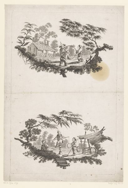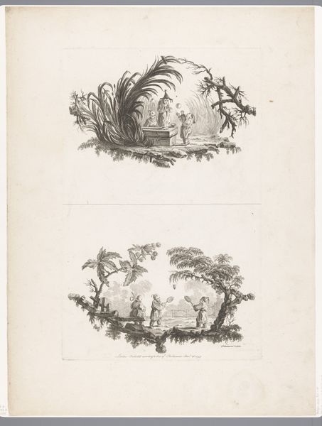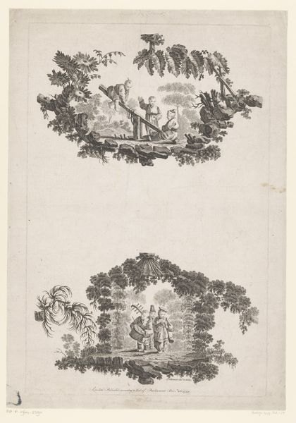 Curator: This print, titled "Kinderen met blaaspijp en hinkelende kinderen," or "Children with blowpipe and hopscotch children" as we'd say in English, is attributed to Pierre Charles Canot, and likely dates to 1759. It's an etching that lives here at the Rijksmuseum. Editor: The whimsical vignettes grab you right away, don’t they? Almost like peering into two separate, miniature worlds, little stages showcasing children at play. The monochromatic rendering lends a dreamy quality, as if it were a faded memory. Curator: It's fascinating to consider the labor involved in etching. Think of the artist carefully coating a metal plate, meticulously drawing through the wax, then using acid to bite into the metal, layer by layer. There’s a whole economy built around printmaking at the time; Consider the distribution network to get the imagery from Canot’s studio to homes or print shops all around Europe. Editor: It certainly invites a childlike wonder, this world. These scenes – hopscotch, a homemade instrument – feel incredibly familiar, transcending time. But there’s a distance too, watching them like figures in a snow globe. Does that separation speak to the era itself? Curator: The genre scenes provide a glimpse into everyday life of children from that time, but within very elaborate frames— botanical on one side and an intriguing, gnarled tree on the other. Editor: The way those little branches cradle the children makes me think about fleeting innocence—the way the sharp realities of the world begin to pierce those earliest days of play. Each scene feels like a moment about to break, about to fall. I appreciate this artwork, that I keep rethinking what is and how its materials contribute to my perceptions. Curator: And it really makes you question what childhood and play even looked like then. Canot is documenting, but he's also presenting these kids in very controlled landscapes; like he is trying to frame time, so it would remain stuck to a particular instant. Editor: Mmm, yes! I leave this listening experience both aware of the artifice involved and somehow more appreciative of my present materials!