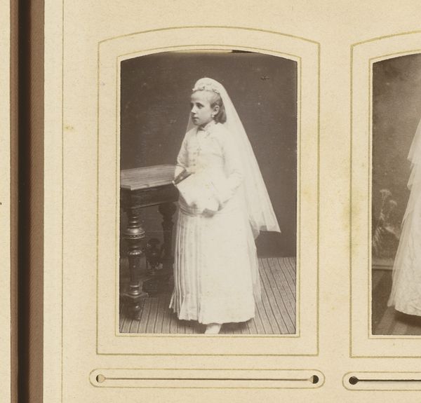 Curator: I find this image strangely haunting, like a memento mori disguised as innocence. Editor: Well, let's contextualize what we're looking at. This is a photograph entitled "Portret van een meisje in communiejurk, staand bij een stoel" or "Portrait of a girl in communion dress, standing by a chair," taken sometime between 1868 and 1900 by Hermanus Jodocus Weesing. We see a young girl in her communion dress posing stiffly next to a chair. Curator: It's the layers of white that strike me, materially so symbolic. The lace, the veil, the tiered dress. There's so much fabric here; what were the textile economies supporting these displays? How readily available would such ornamentation have been? Editor: Right, the communion dress acts as a marker of transition within a deeply religious societal framework. It signifies purity, devotion, and belonging, but also societal expectations being imposed on the female body. It’s interesting to examine this image alongside the religious climate of the time and evolving ideas of womanhood and female innocence. Curator: Her stillness is almost unnerving. Is it patience, resignation, or even defiance? Children were increasingly presented as vessels of piety, but photography, though technically novel, perpetuated a mode of visual constraint. Editor: Indeed, the formal, constructed nature of the photograph, its albumen print perhaps painstakingly hand-toned, echoes the rigid social constraints imposed on girls at the time. The act of making itself contributes to our understanding of how images play roles in ideological regulation. It allows us to speculate about the girl herself. Did she dream beyond what's in view? Curator: I see both performance and capture. Editor: As do I, highlighting for me the rich, interwoven narratives present in material artifacts and our readings of them. Thank you for drawing out that rich sociohistorical tapestry!