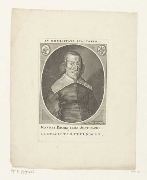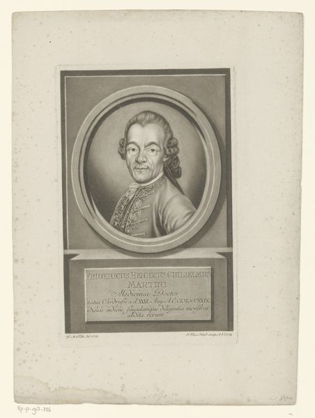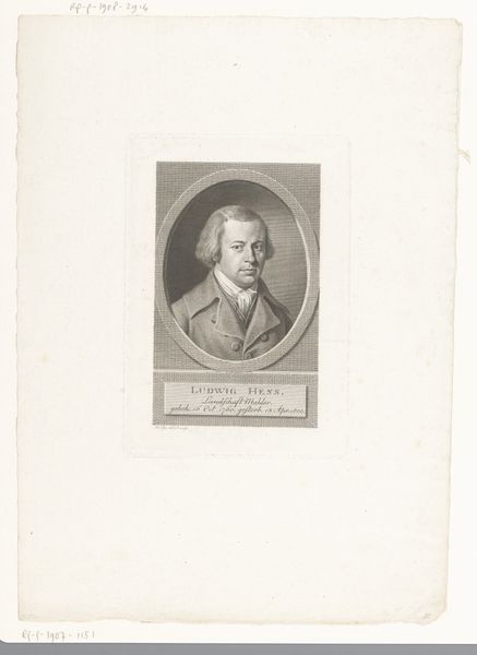 Curator: Let’s turn our attention to a monochrome engraving on paper from around 1793-1840, "Portret van Johannes Albertus Hoekstra", made by Leo Wolf. Editor: He has a serious face. Stark in its simplicity and the way it confronts us. The precision of the engraving renders this man's gaze with unnerving clarity; he appears resolute and… burdened? Curator: Observe how the engraver, Wolf, used fine lines to define the planes of Hoekstra's face. Note also the oval frame; a conventional pictorial device indicating status. This tightly controlled image directs the eye to Hoekstra himself, centralizing the figure and producing clarity in a formal sense. Editor: While Wolf employs the visual language of 18th-century respectability to monumentalize this figure, look closer at the inscription below the portrait. Hoekstra's positions of social significance suggest his political leanings. The inscription below his image speaks of his connections to religious and learned societies, pinpointing the crucial relationships between theology, philosophy and socio-political change. How does this inform our understanding of the man and the burden you alluded to earlier? Curator: Your point highlights how artistic interpretation often intersects with broader social trends. Focusing on craft, I can see that this work testifies to Wolf's proficiency as an engraver. He captured a likeness using only line, shadow, and tonal variation. And I can see it even from the way his dark coat offsets his powdered hair; that creates a striking interplay of texture against what would likely be his somber role within religious society. Editor: I'm also intrigued by the role of engravings during this period as both a democratic tool of mass distribution and representation for elites. Wolf's piece serves not merely to commemorate a man's likeness, but also testifies the powerful role of individuals driving religious reform during a transformative era of enlightenment ideals challenging orthodoxy across Europe. It's also important to consider the legacy and political background influencing men like Hoekstra at the nexus of faith and modernization… Curator: It seems like the engraving is a gateway to historical narratives. Its stark features have inspired interpretations as boundless as history itself. Editor: Precisely; its impact persists far beyond surface analysis as our understanding and engagement with political upheaval grows ever sharper.
