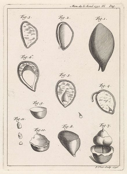 Editor: Here we have "Negen schelpen," or "Nine Shells," made between 1705 and 1816 by an anonymous artist. It’s an engraving in ink, pencil and paper, of, well, nine shells. They're arranged in a grid, and each one is rendered with incredibly fine detail. It makes me think of early scientific illustration, with this blend of precision and artistry. How would you interpret this work, focusing on its artistic merits? Curator: This engraving presents an intriguing formal study. Note the artist’s acute attention to texture, achieved through the precise application of line. Consider how the varying densities of hatching and cross-hatching model the curvature of each shell, creating a tangible sense of volume. Do you see how each shell becomes a self-contained exercise in tonal variation? Editor: I do. And the light seems to almost emanate from within the shells, despite the limited palette. It's more than just a record, there is some added depth of illumination that highlights the shape. Curator: Precisely. The artist manipulates the formal elements—line, tone, composition—to transcend mere representation. Observe also the compositional choices, which echo Baroque sensibilities. The artist plays with visual weights and counterweights within a geometric, gridded framework to explore symmetry and asymmetry, order and variation, all at once. What do you think of the effect achieved? Editor: I suppose it gives it both a sense of controlled observation, like you said, while keeping things visually engaging through differences in shadow and shape. Are the empty spaces equally important in understanding the relationship between these diverse, but similar shells? Curator: Indeed. The negative space acts as a visual buffer, allowing each shell to be appreciated individually while also contributing to the overall structure. Notice how this structured approach emphasizes that no shell overshadows another, and allows one to consider each of them as part of a whole. What are your thoughts? Editor: It’s fascinating how much can be gleaned from such a seemingly simple subject through attention to its formal qualities. I appreciate the insight into seeing the play of lines and tones, I understand how important an individual component becomes to seeing the total design. Curator: Indeed. A close look at form reveals a world of meaning.
