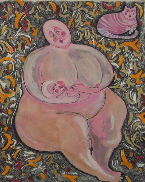 Małgorzata Serwatka painted "Mother 5" without indicating a precise date, using an unknown medium on canvas. This intimate portrayal of motherhood invites reflection on the social and cultural values surrounding women's roles. Painted in Poland, this artwork enters a conversation with religious iconography, specifically the Madonna and Child. The painting recasts the archetypal mother figure in a contemporary light. The fleshy, oversized figure rejects conventional ideals of feminine beauty. Her body becomes a symbol of strength and fertility. The floating faces create an unsettling effect, perhaps alluding to the challenges and anxieties inherent in motherhood. This painting prompts questions about the representation of women in art and society. To understand Serwatka's work fully, one might examine feminist art history, Polish cultural history, and theological studies. By exploring these resources, we can gain a deeper appreciation for the complex meanings embedded in this seemingly simple image.