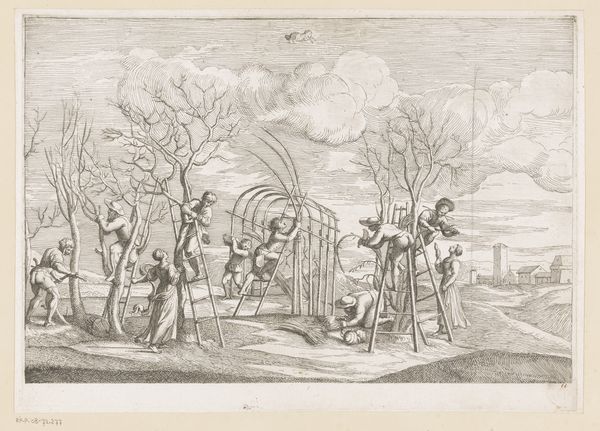 Curator: Looking at this detailed engraving by Simon Fokke, created around 1752, titled "Turfschip van Breda, 1590," I'm immediately struck by its dynamic energy despite the relatively limited tonal range of the print. Editor: It feels so staged and purposeful. I can feel the weight of a very male-dominated power play from an era characterized by religious conflicts. Curator: Indeed. The image commemorates a historical event: the capture of Breda Castle in 1590. The 'turfschip' refers to a boat disguised as a peat barge. Editor: Yes, the symbolism there is layered isn’t it? Peat itself is this dark, earthy fuel—literally feeding a community but visually heavy and concealed, which perfectly mirrors the clandestine operation and speaks to broader concepts of land, resources, and dominion in the Dutch consciousness at the time. The castle looming in the background feels less powerful and slightly naive with that towering flag pole in front of it. Curator: I completely agree. Focusing on how that very public show of power of the flag distracts from what is really occurring in the image, what’s most impactful for me, however, is the socio-political undertones. How the subjugation of the city becomes synonymous with ideas around ethnic and religious dominance—it tells us volumes about the prevailing culture back then and allows us to dissect our contemporary social constructs surrounding class and race. The composition cleverly juxtaposes clandestine maneuver and a full blown declaration. Editor: Precisely. And while seemingly a historical depiction of military strategy, it speaks to the wider themes of trickery and concealment across time, even tapping into the symbolic value of boats. I wonder how viewers at the time perceived such a powerful moment visualized. Curator: An astute point. It really prompts me to consider how artists then, as now, subtly but purposefully encode their sociopolitical views in seemingly neutral depictions of commonplace things and scenes, and these become part of our cultural visual library. Editor: It leaves you considering so much, from our reliance on cultural symbols and strategies to how deeply entrenched cultural values actually affect us.