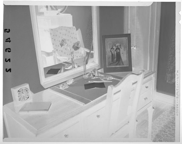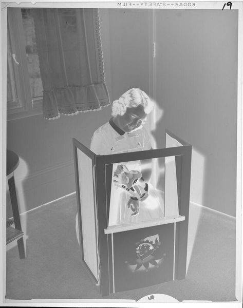 Editor: This intriguing photograph, "Untitled (boy performing homemade puppet show)" by Lucian and Mary Brown, captures a child's world of imagination. The negative image gives it a ghostly, dreamlike quality. What draws your eye to this piece? Curator: The raw, unfiltered joy radiating from the boy's face, even in this inverted image, is infectious. It whispers of childhood's boundless creativity, when a simple puppet show can become a portal to another world. Don't you think it also speaks volumes about resourcefulness? Editor: I do. The homemade quality of the puppet show is so charming. It makes me think about how art can be found in the everyday. Curator: Precisely! And how sometimes, the most profound art emerges from the simplest materials, fueled by pure imagination. It’s a beautiful reminder, isn’t it?