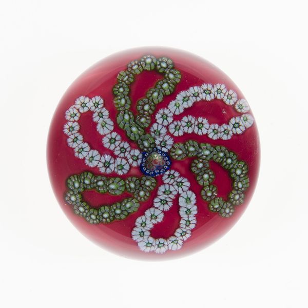 Editor: Here we have a paperweight by the Gilliland Glass Manufactory, around 1880. It’s made of glass and… possibly some kind of paper composite for the details? It’s giving off a surprisingly vibrant and almost whimsical vibe, mostly due to that radiant pink. How do you read it? Curator: Let’s consider its formal properties. Observe how the composition centers around a radial design. A cluster of botanical elements rendered in green and blue glass occupies the core. This nucleus is enveloped by a spiraling pink latticework. How does this intricate arrangement influence the visual dynamics, would you say? Editor: Well, the spiral definitely draws the eye inward. It almost feels like a whirlpool pulling you down into the center of the paperweight. I hadn't really considered the underlying pattern beyond that pink! Curator: Indeed. And note the periphery: a ring of delicate millefiori florets which defines and contains the composition. Reflect upon the glass itself—its texture, its transparency, the manipulation required to achieve this level of detail. How does materiality itself speak to the work's function as both art object and utilitarian item? Editor: So, it's not *just* about decoration, but also about showing off the skill and technique? Curator: Precisely. The medium dictates the message in many ways here. Editor: This makes me appreciate how everything contributes to the aesthetic, even materials and placement! Thank you. Curator: My pleasure. Paying such close attention to intrinsic formal components and material, allows a richer reading of any artwork.