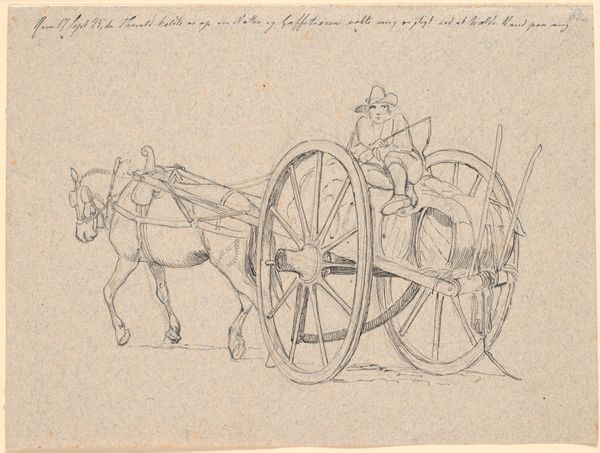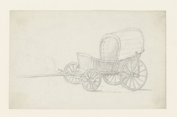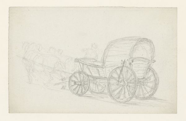 Editor: This is "Paard met wagen bij een voederbak op het landgoed Rhederoord" - or, "Horse and wagon by a feeding trough at the Rhederoord estate"— a drawing from 1833 by Johannes Tavenraat. It's made with graphite, pencil, and coloured pencil. It feels like a very quiet, intimate moment. What do you see in this piece? Curator: I see a snapshot of rural life, but more importantly, I see a document that can open discussions around labour, animal rights, and the commodification of nature in the 19th century. This scene isn't just pastoral; it’s about power dynamics. How does Tavenraat’s choice of subject matter, and his style, either reinforce or subtly critique the societal norms around these issues? Editor: That's a great point. I hadn't considered it that way. The horse, though central, doesn't seem to be glorified. Curator: Exactly. Think about who commissioned or bought such works. These landowners benefited directly from both the labour of people *and* animals. Doesn't the depiction subtly normalize and aestheticize this imbalance? Editor: It’s definitely something to consider, yes. It makes me think about other artistic portrayals of rural life during the period, and what they might be telling us, too. Curator: And whose stories are *not* being told in these idyllic landscapes? Who is missing from the frame? These are the questions we must always ask. Editor: Absolutely. I now look at the drawing differently. It's not just a charming rural scene; it prompts reflections on power structures and social justice in a specific historical context. Curator: Indeed. Art is rarely just about aesthetics. It reflects and often reinforces existing ideologies. Analyzing it is always more than looking; it’s about unpacking and deconstructing.