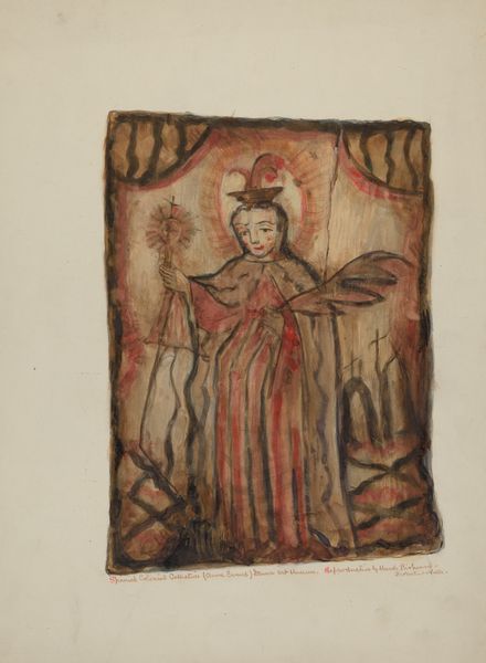Maude Valle painted this Santos Retablos, probably in watercolour, and it feels like a very personal act. Valle's colour choices are what draw me in. She's working with a muted palette, but there’s a real vibrancy in the reds, which are layered to create a sense of depth. Look at the way the paint is applied. It’s thin, almost transparent, allowing the paper to breathe through, giving it a delicate, ethereal quality. It's like she's revealing something, not just depicting it. The halo around the figure's head is made of these simple radiating lines, giving an impression of light, and drawing your attention to this central figure. Valle's painting reminds me a little of Marsden Hartley, another artist who sought out folk art traditions, embracing its directness and emotional honesty. It’s a reminder that art is always a conversation, and the most interesting voices are often those that speak from the heart.
