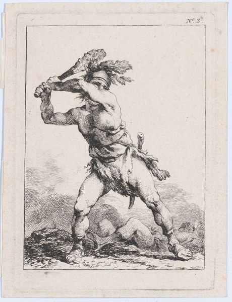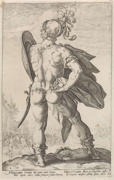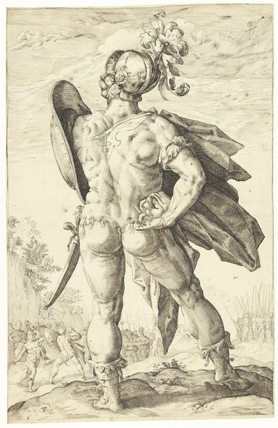 Editor: So, we're looking at Guido Reni's "Saint Christopher walking with the infant Christ on his right shoulder," created sometime between 1595 and 1645. It's a drawing or print, and I’m struck by the sheer muscularity of Saint Christopher – he really fills the frame. What social function would such a physically imposing religious figure serve, do you think? Curator: That's an insightful observation. The figure's monumentality connects to the Baroque era's emphasis on drama and emotional intensity. Representations of Saint Christopher in art often served as public declarations of faith, a sort of spiritual insurance. Placing these images prominently was believed to ward off the plague or guarantee a good death. Is he displayed prominently, can you tell if its for devotion or warning? Editor: That's interesting, thinking about this image as more of a warning than a symbol of devotion. It makes you consider the fear during times of plague. He’s not looking very welcoming or compassionate! How does the portrayal of the infant Christ factor into this? Curator: Absolutely! Consider that the weight of the Christ child— barely perceptible in the image, yet he carries the world's sins. How does Reni visually communicate the magnitude of this symbolic burden, especially considering the medium of printmaking that makes these widely available? Editor: He communicates it through Saint Christopher, right? The straining muscles, the determined look… and knowing it’s intended for mass distribution. I guess seeing the artwork now gives me a real connection to those fears and hopes people had back then. Curator: Precisely. It highlights the power of images to convey both religious and social meanings, making even prints a powerful means of cultural influence and control. And it tells us something about how we cope in times of widespread fear.