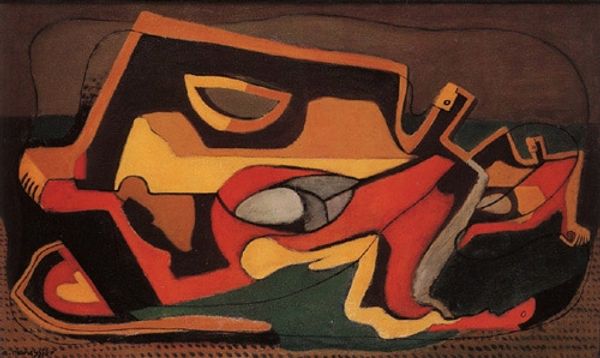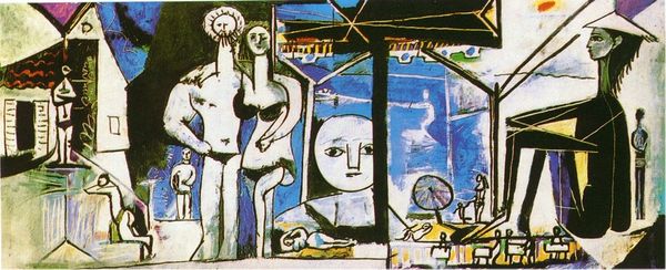 Curator: Pablo Picasso created "Lying Female Nude" in 1964 using oil paint. What are your first impressions of it? Editor: My immediate reaction is that of unease. There's something disorienting about the figure's proportions and the way the artist fragments and reconstructs her form. Curator: The cubist influence is undeniable here. Note how Picasso presents multiple perspectives simultaneously. Her face, for instance, seems to show both profile and frontal views at once. This challenges our conventional perception of a fixed viewpoint. Editor: Exactly, and it’s in those multiple perspectives where meaning resides. That doubled or tripled view, it conveys both vulnerability and a guarded interiority; the nude’s gaze almost seems to be directed inward, rather than engaging with the viewer. Is this a symbol of the fragmented self in modern experience? Curator: It's an intriguing possibility, and we can unpack that further. Think about the palette. The juxtaposition of cool blues and whites with warm browns and yellows creates a striking contrast. Does that create a sense of disharmony? Editor: Possibly! I am also drawn to how he utilizes what appears to be heavy brushwork which suggests not only a physicality but also emotional expressiveness. The act of painting, the construction, seems just as critical to the overall theme. Curator: A compelling argument. Also notice the symbols like the suggestion of a cat in the background. This contributes another layer to interpretation to Picasso's emotional state with his tumultuous personal life. Editor: Symbols abound, don't they? We shouldn't overlook the pose of the nude itself, echoing centuries of artistic tradition while simultaneously subverting it. It challenges the notion of passive objectification by depicting a female subject with agency. Curator: The genius lies in its refusal to offer easy answers. We see layers of formal complexities as well as evocative visual imagery and potential interpretations. Editor: True. In the end, this encounter with "Lying Female Nude" reinforces how powerful an artwork can be, particularly in visual semiotics when it encourages each viewer to actively interpret their own truths.