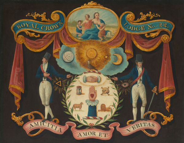Curator: What a vibrant image! My first impression is one of organised chaos. All these symbols, texts, colours...It is captivating. Editor: Let’s delve into this artwork a bit more. It's titled “Wappen,” and it is by August Natterer, who employed mixed media, including drawing and painting, in his practice. It presents, at least at first glance, figuration typical for portraits or family crests, but there's something that immediately breaks it down. Curator: Yes, traditionally coats of arms are symbols of authority, heredity, and status. Natterer presents what seems to be family symbols; however, the handmade feel, especially the very visible brushstrokes and pencil marks, give a certain raw edge. There's a tangible sense of labour that counteracts the inherent elitism. The drawing looks like craft. Editor: I agree. The very choice of depicting family names could be rooted in social ambition or simply nostalgia; his social reality had profound repercussions in his life, which might indicate a social comment, if a raw one. And let's look at how social institutions might have played a role. Considering that Natterer was diagnosed with schizophrenia, it is very possible that the institution where he was placed—his reality from then on—encouraged or shaped the narrative behind this imagery. The location where such art pieces have been shown shapes our interpretations even to this day. Curator: Absolutely. It almost reverses traditional ideas. The medium itself – the material – becomes a message. The imperfections point to the human hand, and the process. How different this piece would feel had he, say, chosen to embroider those family seals with silver thread! I would also be interested to explore what types of readily available supplies were accessible to him where he worked on this piece. Editor: I agree; however, looking through this more socially oriented lens is not devoid of pitfalls. If the production material became a point of reference and a source of symbolism, and meaning, where does that leave us? Curator: I'd say with an intriguing puzzle, reflecting the blurred lines between status, craft, and the artist's internal reality. It is beautiful and fascinating how Natterer brought the material and social history into our view. Editor: Exactly. A truly insightful synthesis, leaving us with a greater appreciation of its multifaceted nature.