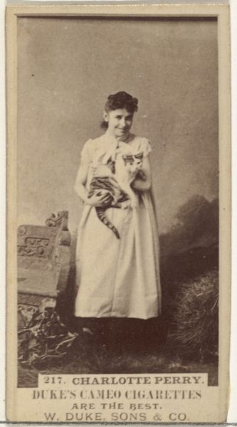 This photographic card, distributed by Duke Sons & Co., features an actress cradling a small dog, a common motif in portrayals of women across centuries. The tender embrace between woman and animal echoes back to ancient depictions of goddesses with their sacred animals. Think of Isis with her cow, or Diana, the huntress, with her hounds; symbols of fertility, protection, and the nurturing aspects of the divine feminine. This archetypal connection resurfaces in Renaissance portraits of noblewomen with lapdogs, signifying wealth and domesticity. Here, the gesture carries a trace of those earlier meanings, yet it's also transformed. In this modern context, the dog represents companionship, perhaps hinting at the actress's own need for connection in a transient world of performance. The embrace speaks to a deeper, primal bond with the natural world, a longing for simplicity amid societal complexities. Such imagery reminds us that these visual echoes are never truly lost but rather are continually reshaped by history and personal experience.