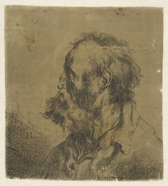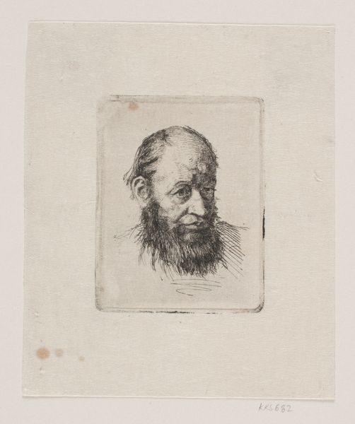 Editor: This is Rembrandt van Rijn’s “Bald old man with a short beard, in profile right,” an etching from 1635. It's such a delicate image. I'm immediately struck by the contrast between the loosely sketched background and the incredibly detailed rendering of the man's face. How should we interpret the way Rembrandt chose to portray this man and, especially, what could he want to convey about ageing in the Dutch Golden Age? Curator: That's a wonderful question! Considering the historical context, portraiture in 17th-century Netherlands wasn't merely about capturing likeness. It was about conveying social status, moral character, and individual achievement. Notice the sitter's garment, probably a "tabbaard". Such "tabbaards", an informal housecoat worn in the home and in artists’ studios, lent dignity and scholarly ethos to the subject, so the purpose was clearly to study a particular personality, which was important within the public and commercial artistic system in Amsterdam at that time. So the goal was to capture the interiority, a reflection on mortality and wisdom through age. Editor: That’s insightful! I hadn't considered the significance of the garment. Is it possible that Rembrandt also challenged societal views on age by choosing an “ordinary” man, instead of, say, a regal or affluent character? Curator: Absolutely. Rembrandt was fascinated by the everyday. He elevated the mundane to a level of artistic and social significance, perhaps democratising the visual landscape by placing value on those often overlooked in grand history paintings. Editor: So, by focusing on this particular individual, and giving him such a presence through his mastery, Rembrandt might also have advocated for the recognition of wisdom found outside traditional power structures. Thank you for your clarifications! Curator: Precisely! And understanding the socio-political factors during the Dutch Golden Age allows us to appreciate the radical, often subtle ways artists could challenge prevailing norms and reflect on universal experiences like aging.