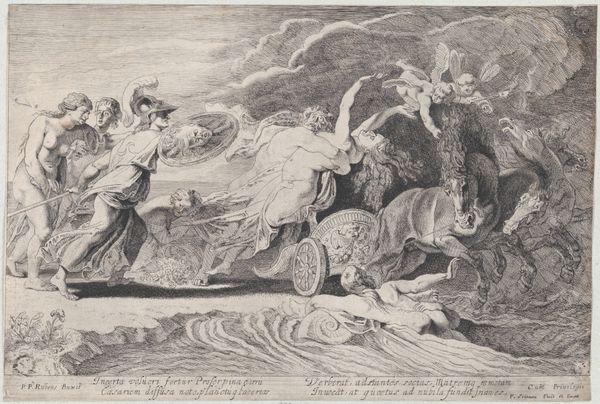 This is a reproduction of a print, likely after a fresco by Guido Reni, depicting Aurora. The print presents a linear composition of classical figures set against a backdrop of swirling clouds and a distant landscape. Notice how the composition moves horizontally, leading the eye from left to right, mirroring the dawn’s progression across the sky. The figures are rendered with fine lines, creating a sense of movement and lightness. The artist uses the contrast of light and shadow to model the forms, giving them volume and depth. There is a hierarchy established by the strategic placement of figures in the scene. The organization and arrangement of figures along a horizontal plane suggests an idealized vision of classical mythology and its influence on artistic expression. It invites us to consider how artists of the time sought to capture a sense of beauty through a structured and ordered composition. Ultimately, its form evokes the continuous cycle of time and nature's enduring beauty.