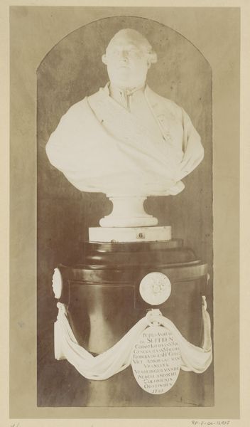 Curator: Here we have Louis Plogsted’s drawing "Statue," created sometime between 1935 and 1942 using charcoal and graphite. The artwork presents a study of a statue depicting a uniformed firefighter. What strikes you about this, at first glance? Editor: Its austere quality is immediately apparent, an effect intensified by the monochromatic medium. It feels rigid, almost neoclassical in its deliberate, idealized form. Curator: That rigidity speaks to its possible function. Statues, particularly those of public figures, serve as cultural anchors, meant to embody a set of values. This firefighter, standing tall, likely symbolized courage, duty, and service to the community. The placement atop a base decorated with wave-like designs might also speak to fire-fighting in a specific geographic area near water. Editor: Interesting. Looking at the drawing itself, I am fascinated by how Plogsted balances detailed areas like the firefighter's face with more broadly rendered sections like the coat and legs. It brings focus without making it photographic. The line is precise, almost architectural. Curator: It's true, there’s a calculated order. The drawing may even be a preparatory sketch for an actual statue. I notice the placement of the helmet – a direct nod to the figure’s trade. Its presence on the head bears so much meaning! It embodies the danger that those in the firefighting professions bravely undertake. Editor: The shadowing created by the charcoal defines the man’s stoicism, it gives weight to his composure, wouldn’t you agree? Also, what of the horn object that he is holding? I wonder about its functionality, if it really belonged to this fireman. Curator: Indeed. These public statues were about portraying civic virtue in a relatable form. The drawing style itself adds a certain heroic dimension – perhaps an echo of classical sculpture styles in a modern age of public service. In some cultures fire fighters were very valorized! The subject's expression reveals the dedication these fire fighters hold, for both the people they served, and to their duty. It speaks volumes of American work culture at that time. Editor: It really brings that sense of historical presence forward. There is so much you notice in this image with each successive glance. Curator: It gives new perspectives to cultural awareness, I'm thankful we can share it today.