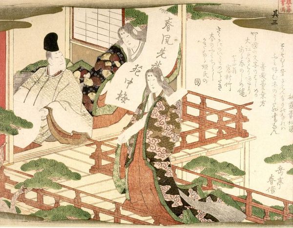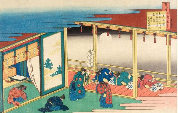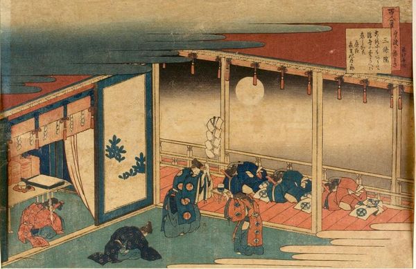 Curator: Katsushika Hokusai’s woodblock print, "Yoshida on the Tōkaidō," part of his "Thirty-Six Views of Mount Fuji" series, presents a roadside scene. Editor: The immediate impression is one of weariness, even exhaustion, contrasted with the iconic mountain in the distance. Curator: The figures suggest travellers pausing at a tea house. Hokusai masterfully uses the tea house as a framing device. The mountain operates as a cultural anchor. Editor: I am struck by the material choices. The varying tones of blue, achieved through different applications of pigment, communicate the scene's mood. Curator: The print signifies a moment of respite within the larger journey, but the mountain looming large serves as a reminder of the journey's wider cultural and spiritual significance. Editor: Absolutely. And it’s interesting to consider the labour involved in producing such a detailed image, one intended for wider consumption along that very Tōkaidō road. Curator: It presents a potent combination of everyday experience and enduring cultural symbol. Editor: A great reminder of the social and material life embedded within art.