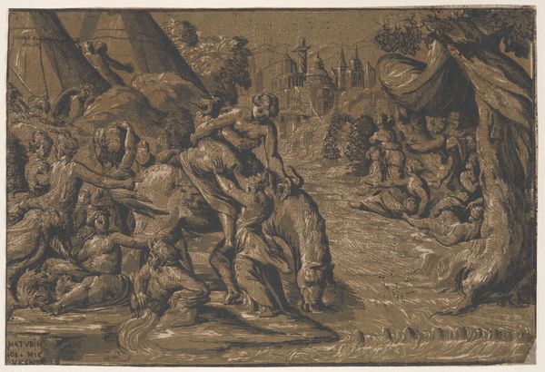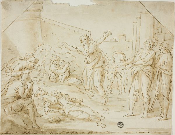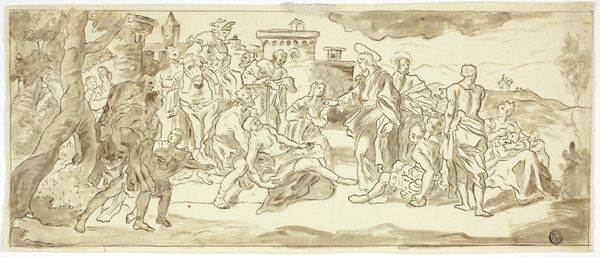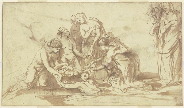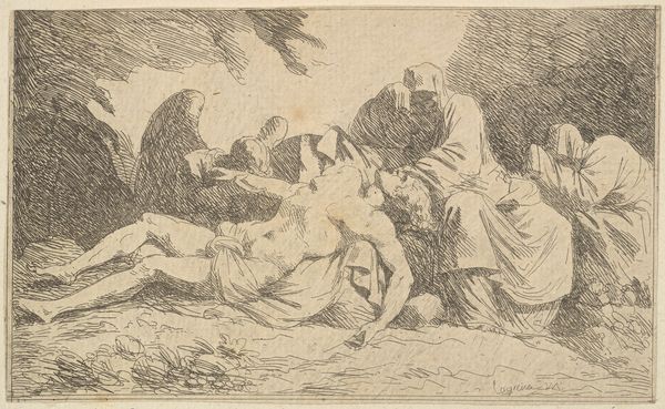 Editor: So, this is Matteo Rosselli's "Lamentation of Christ," a drawing, likely from the 17th century, done in ink, chalk, and graphite on paper. It immediately strikes me as a study in grief; the figures seem almost collapsing in on themselves. What catches your eye? Curator: It's interesting you say collapsing, I feel as though they’re almost being pulled downwards, like gravity has become intensely sorrowful itself. It reminds me of those moments when grief feels like a physical weight, pressing down on everything. The monochromatic palette enhances this feeling, like a faded memory. But look closely, do you notice how Rosselli uses light and shadow? It's Baroque, alright. Editor: Yes, now that you point it out, there's a real drama to the lighting, even in this drawing. Is it meant to focus our attention? Curator: Exactly! Notice how the body of Christ is the brightest part? But consider also how the artist placed the cross and some figures in the background. I wonder, do you think the landscape complements the feeling that is expressed here? Editor: Definitely, the setting adds to the weightiness. It is not particularly detailed, as if nature is sharing and mirroring the emotions of those mourning in the foreground, focusing entirely on them instead. How remarkable. I hadn't fully appreciated that before. Curator: Isn't it marvelous how a simple drawing can contain such profound emotional depth? I leave with a strong connection to shared pain.