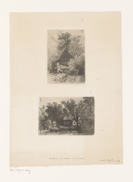 Andreas Achenbach’s diminutive etching, "Landschap met wasvrouwen bij een watermolen," captures a quaint scene with its intricate network of lines and textures. The composition, dominated by the architecture of the watermill and the organic forms of trees, invites us to contemplate the interplay between nature and human construction. Achenbach’s command of line is particularly striking, as he uses it to delineate the thatched roofs, foliage, and reflections in the water. These lines, though delicate, contribute to the overall sense of depth and movement. The texture he creates is especially intriguing, as it hints at the materiality of the buildings and the natural roughness of the landscape. The artwork subtly explores themes of labor and leisure, embedding them within a picturesque landscape. The wasvrouwen, seemingly small, are crucial to the scene's narrative, bringing a human element to the architecture and nature around them. This juxtaposition encourages us to think about the complex relationship between humans and their environment, captured through the structural components of line, form, and composition.