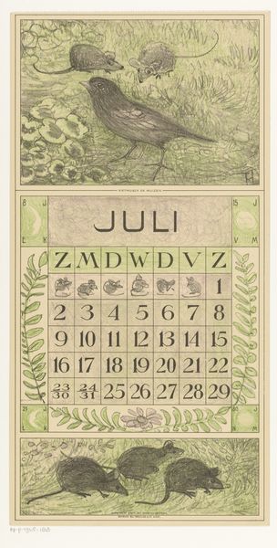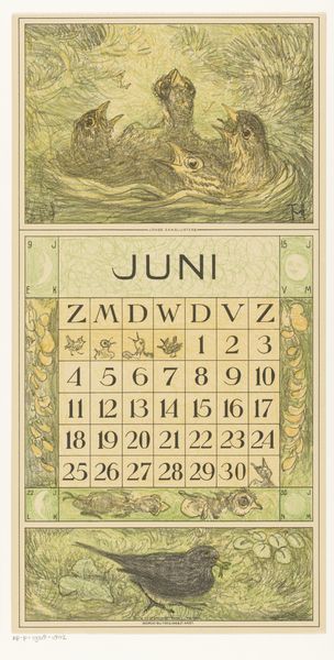Theo van Hoytema made this calendar page for June with makis, probably as a print, sometime around the turn of the last century. It’s all these little lines, hatched and cross-hatched, building up tone, and giving the animals their slightly worried expressions. You can see the process, the way one mark leads to another, building into a kind of funny, fuzzy image. I love the way Hoytema uses this kind of folksy technique, making a potentially scary animal look friendly and approachable. The texture is everything here, the way the pencil or pen creates this almost palpable sense of fur and feather. Look at the pair at the top, there’s almost a human quality to their pose, a kind of tenderness that’s really affecting. It reminds me a little of Redon, with his soft focus and dreamlike imagery, though Hoytema has a kind of directness that’s all his own. Ultimately this piece celebrates the art of making, the beauty of the imperfect, and the power of art to transform the way we see the world.