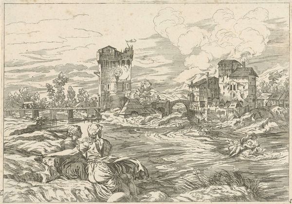Editor: This etching, "Ruins of the Temple of Venus and Roma," was created sometime between 1609 and 1642 by Pieter Bodding van Laer, and it's now at the Rijksmuseum. The landscape feels both epic and intimate; what jumps out at you when you look at it? Curator: It's fascinating how Van Laer uses the ruins. They are not merely stone, but powerful symbols. We see the remnants of Venus, goddess of love, and Roma, the embodiment of the Roman state, juxtaposed with daily life. What does that juxtaposition suggest to you? Editor: Maybe the everyday continuing, regardless of history’s grandeur and decline? There's something melancholy about it. Curator: Precisely! The ruin is a memento mori – a reminder of mortality and the ephemeral nature of earthly power and beauty. It invites contemplation. What’s curious is the inclusion of peasants and animals. Consider how this imagery would resonate with his audience. What kind of memory is he building or deconstructing here? Editor: It makes it more human, less about gods and emperors, and more about ordinary existence. Did people at the time see ruins the same way we do now, as something romantic? Curator: It’s likely there were varying perspectives, much like today. Ruins could represent the faded glory of Rome or the triumph of Christianity over paganism. It depended on one's ideological viewpoint. And Van Laer, by etching this scene, becomes a part of that visual conversation, perpetuating those interpretations, wouldn’t you agree? Editor: I do! It’s incredible how much information can be packed into one image. Now, I see how he creates meaning through what he chooses to show, and how he places these images together to trigger understanding of the world through the language of ruins. Curator: Exactly. The language of ruins and the art of cultural memory, constantly being rewritten and reinterpreted!