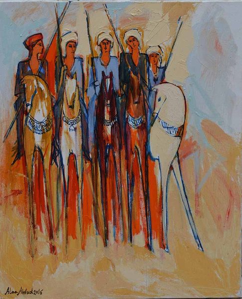 Alaa Awad made this painting, 'The Fencing Elmermah,' using acrylics to portray a scene rich in cultural significance. Set against a backdrop of onlookers, the image depicts a traditional fencing display on horseback. It is a powerful emblem of cultural heritage, likely made in Egypt, where Alaa Awad lives and works. Such displays are often community events, reinforcing social bonds and cultural identity. Awad's modern style combined with historical themes encourages us to think about how traditions are remembered, reshaped, and represented in contemporary society. The artist's choice to depict this scene invites questions about cultural preservation and the role of art in maintaining collective memory. By studying the visual elements and cultural context, we can better understand the painting's statement on the endurance and evolution of Egyptian traditions.