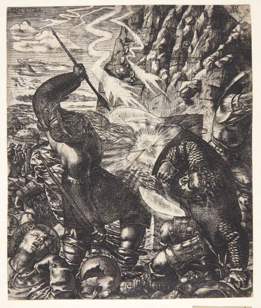 This print, "Opstanding", was made by Philipp Uffenbach in the late 16th or early 17th century, using the intaglio process of etching. A metal plate, most likely copper, was coated with a waxy ground, into which the artist scratched his design. The plate was then submerged in acid, which bit away the exposed lines, allowing them to hold ink. Look closely, and you can see how Uffenbach has used the etched line to create a complex scene. The relatively soft, irregular quality of the etched line allowed for a great deal of expressive freedom. He would have controlled the depth of the line by varying the time the plate spent in the acid bath. This is especially evident in the bold hatching used to model the figures and create a sense of depth. Consider the labor involved in producing such a print: the skilled work of the etcher, of course, but also the labor of the papermaker and the printer. Prints like this one were a key means of disseminating images and ideas in early modern Europe, contributing to a growing culture of visual literacy and a wider distribution of knowledge. They challenge our ideas about what constitutes ‘art,’ and remind us that images have always been made and circulated through a complex web of social and economic relations.