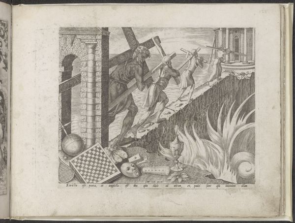 Philips Galle created this engraving, "Simson verwoest de tempel van de Filistijnen", in the late 16th century. This piece throws us right into an Old Testament story, one filled with vengeance and strength. Samson, a Hebrew judge known for his incredible power, is seen here enacting a final act of defiance against the Philistines who captured and blinded him. The scene is chaotic. Galle masterfully captures the moment when Samson, with his regained strength, pushes apart the pillars holding up the temple, causing it to collapse upon himself and his enemies. The engraving illustrates themes of power, betrayal, and retribution, all wrapped up in a narrative that speaks to cultural and religious identity. Consider the emotional weight of this scene – the desperation and rage, but also the sense of sacrifice. In a time of religious conflict and identity struggles, how might viewers have seen themselves in this story of defiance? While it might glorify masculine strength, doesn't it also speak to the cost of vengeance, and the tragic intersection of power and destruction?