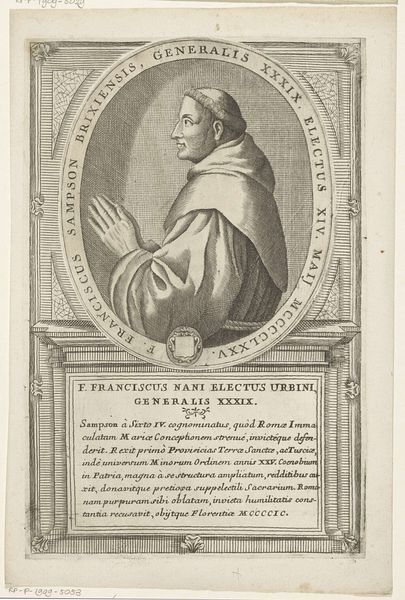 Editor: Here we have a baroque engraving, “Portret van Gulielmus Janettinus,” created sometime between 1710 and 1738 by Antonio Luciani. It's very detailed, almost like a page torn from a history book. How do you interpret this work, especially given the emphasis on text around the portrait? Curator: This portrait offers us a glimpse into the world of symbols and their enduring meanings. The text framing the image isn't merely descriptive; it’s an integral part of the visual statement. Note how the sitter's gaze and gesture towards the book converge. Do you see the suggestion that he is deeply engaged with knowledge and learning? Editor: Yes, his hand placement definitely draws attention to the book. Is the surrounding text then reinforcing his learned persona? Curator: Precisely. The text emphasizes his position and accomplishments. Think of portraiture during this era, how it served as a visual articulation of social standing and personal identity. Consider the cultural memory embedded within the image itself, from the symbolic weight of the book to the baroque framing—what feelings do these stylistic markers invoke for us? Editor: I see how everything seems purposefully placed to convey authority. It makes me wonder how much control Janettinus himself had over this representation. Curator: An insightful question. Power dynamics played a large role in artistic creation. These images speak to a cultural understanding of authority and its visual representation. Looking closely, what inferences can you make from the heraldic devices present? They can often give clues as to ancestral achievements and familial status. Editor: I hadn’t considered the heraldry. That adds another layer to the image! I now view the engraving as more than just a likeness; it’s a carefully constructed symbol. Curator: Exactly. By examining its symbolic elements, we begin to decipher the codes embedded within. We’ve taken a journey into how identity and authority were visually constructed and understood centuries ago.