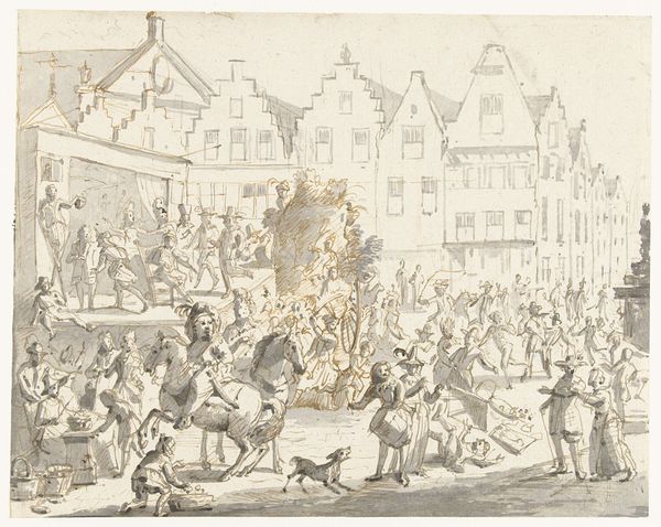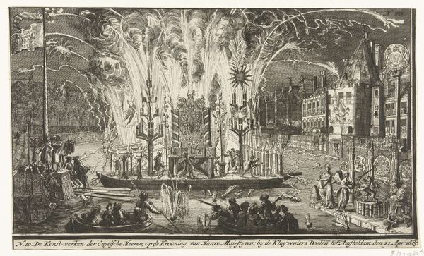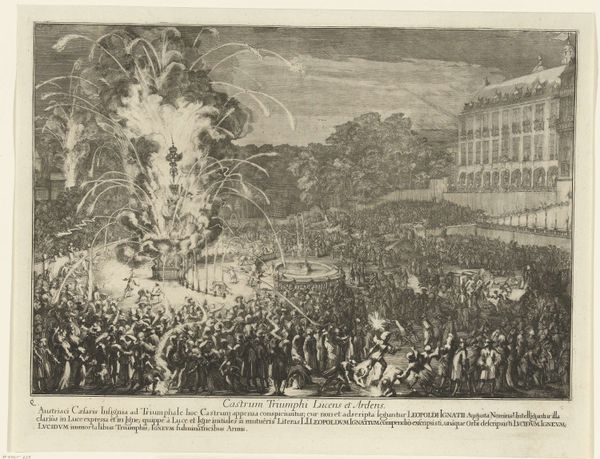 Curator: This dynamic print, “Fireworks at the arrival of Leopold I in Brussels, 1686,” was created by Romeyn de Hooghe. It’s a stunning depiction of a city square alive with spectacle. Editor: My initial impression is one of organized chaos! There's so much detail, all rendered with incredible precision using ink. It evokes a sense of wonder mixed with the frenzy of a massive crowd. Curator: De Hooghe was commissioned to document this historical event. Leopold’s arrival was a carefully orchestrated piece of political theatre and this print played a crucial role in disseminating that message. The means of its production--printmaking—allowed it to reach a broad audience, shaping public perception of Leopold's reign. Editor: Absolutely. We see how the celebratory event is framed by the architecture of Brussels, with fireworks dominating the skyline. But, what sort of social conditions allow the labor and the materials for such a lavish display? Who exactly benefits from its production and consumption? Curator: The print highlights a key moment in the construction of power. Notice the detailed portrayal of the spectators – from the elites in carriages to the common folk jostling for a view. Their engagement, or what is framed to be engagement, legitimizes Leopold's power. The institutions backing De Hooghe directly profited from this exchange. Editor: It’s interesting to consider how De Hooghe utilized engraving to create a sense of depth and movement, almost mirroring the actual explosions. But let's not forget that this imagery could easily be manipulated for ideological ends. It becomes less about the real people and more about the symbol of an orderly state and its authority. Curator: Precisely. And the print's creation and distribution reinforces specific social and political structures. We see evidence of skilled artisans involved in printmaking and it makes one wonder of the resources, skill, and social capital required to even disseminate the event, however indirectly. Editor: De Hooghe, perhaps unwittingly, delivers both propaganda and documentary. It forces us to analyze art as a cultural artefact, reflecting and influencing political thought in Europe. Curator: An image meant to broadcast power, that we can now re-examine through the lens of history and class. Fascinating.