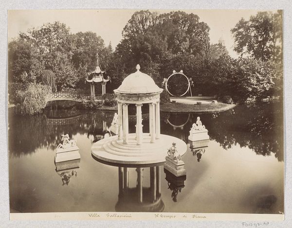 Editor: Here we have Celestino Degoix's "Pond with the Temple of Diana at the Villa Pallavicini in Pegli," a photograph dating from around 1870 to 1890. The still, reflective water and classical architecture give it such a serene, almost dreamlike quality. What draws your eye, and how might you interpret its historical context? Curator: The photograph’s romantic sensibility is unmistakable. Look at how Degoix uses the composition and light to idealize this space. These meticulously designed gardens were expressions of wealth and power. Doesn’t it seem less about capturing the real space, and more about constructing an idealized vision of nature controlled and adorned by humanity? What do you think the inclusion of classical elements, like the Temple of Diana, signified to the villa’s visitors? Editor: It suggests a connection to the grandeur of the past, maybe? A way to legitimize their own wealth and status by aligning it with historical precedents? Curator: Precisely! And consider who this image was intended for. Photographs like these circulated amongst the elite, serving as visual trophies and reinforcing a particular vision of beauty and privilege. It reflects a broader European trend of wealthy families showcasing their cultural sophistication. Editor: So it's less about documenting a physical place, and more about participating in a social and political landscape. A statement, almost? Curator: Exactly. These images helped to construct and reinforce the social hierarchies of the time. It is fascinating how an image designed for aesthetic enjoyment can be so revealing about the cultural forces at play. Editor: I never thought about it that way before, seeing how even landscapes can function as forms of cultural messaging! Thank you!