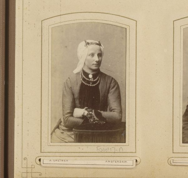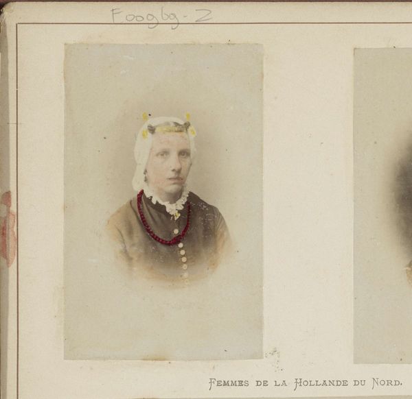 This is a portrait of a woman in traditional North-Holland attire by Andries Jager, made in the 19th century. The composition is immediately striking. The subject is centered, her gaze direct, creating a confrontational yet intimate experience. Notice the limited palette: muted reds and browns against the stark white of her headdress, punctuated by small yellows. These colors aren't merely decorative; they serve to emphasize the cultural codes embedded within the image. The careful arrangement of her clothing and jewelry isn't just about representation; it's a statement. Each element acts as a signifier, pointing to deeper cultural meanings related to identity, region, and perhaps even social status. The formal constraints—the tight crop, the limited color range—invite us to consider how the artist uses these limitations to convey meaning, transforming a simple portrait into a complex cultural text.
