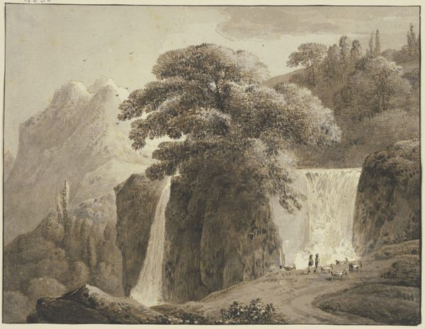 Curator: Friedrich Wilhelm Gmelin’s "The Falls at Tivoli" presents an awe-inspiring scene. Editor: Immediately, I feel a sense of Romantic grandeur, a subtle power in the cascading water contrasted with the delicate figures in the foreground. Curator: Indeed, Gmelin, active in the late 18th and early 19th centuries, was likely interested in the burgeoning print market. Prints such as these allowed landscapes to circulate widely. Editor: The falls themselves become a symbol, then, a testament to nature's untamed force, something that resonated deeply during the Romantic era, didn't it? They are like an emblem of the sublime. Curator: Precisely. And consider the labor required to produce such detailed prints. The etching process itself mirrors the slow, relentless power of the falls. Editor: I see what you mean; the image certainly captures the era's fascination with both the spectacle of nature and its symbolic weight. Curator: A fascinating glimpse into both landscape and labor. Editor: It certainly gives a sense of the artist’s intentions and cultural impact.
