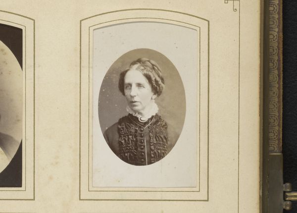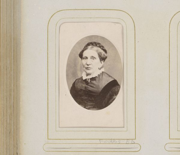Curator: The subtle gradation in this gelatin-silver print from somewhere between 1860 and 1890 creates a rather contemplative effect. We see “Portret van een Vrouw”, attributed to A. Cailloué. What impressions do you gather at first sight? Editor: It’s almost dreamlike. The soft focus gives her a sense of ethereality, emphasized by the pale background. She appears somewhat grave, the composition placing a real weight on her gaze. Curator: The portrait photography that rose to prominence in the mid-19th century played an important role for society. This was due in part to photographic studios developing techniques to democratize the process, making image making more affordable and accessible to the masses. Editor: And her pearl necklace stands out in this monochrome print. Pearls, often associated with purity and even tears, are intriguing against her reserved expression. Was this meant to signal status, virtue, or even repressed emotion, considering Victorian-era conventions? Curator: Indeed, that duality is compelling. Consider the cultural landscape – Victorian society’s rigid norms for women juxtaposed against the burgeoning independence granted through expanding opportunities like education and labor. We often see symbolism employed as a subversive means to both embrace and gently challenge expectation. Editor: So, her modest attire doesn’t negate that pearl necklace. It’s an intriguing play between conventional modesty and subtle assertion of self. The symbolism seems incredibly nuanced in a world of shifting roles and expectations. Curator: Exactly. As photography became more democratic, what we often see in portraiture are very carefully curated expressions of social position, moral fortitude, and aspirational goals. It speaks to the very public roles that even ‘private citizens’ began to cultivate in society at the time. Editor: Seeing this, I wonder what became of her. She feels so tangible, so present, yet forever suspended in this frame and era. The image's soft light immortalizes a moment brimming with complexity. Curator: A single photograph really can open up whole worlds of interpretation, connecting a viewer across generations with these fascinating, if fragile, vestiges of social memory.