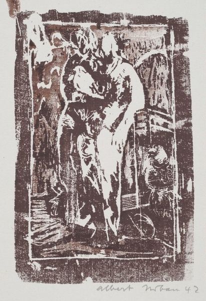 Curator: Here we have Rudy Pozzatti’s 1963 print, "Trajan," a work rendered in ink and graphite on paper. The piece presents a striking, somewhat abstract portrait. Editor: My immediate response is… powerful, yet haunting. The subject's gaze feels both knowing and distant. It has a sense of struggle embedded within it. Curator: Considering the socio-political atmosphere of the early 1960s, this portrayal speaks to larger themes. Pozzatti, working during the height of the Civil Rights Movement and escalating Cold War tensions, reflects on power and authority through the historical figure of Emperor Trajan. This brings forth critical questions of leadership, imperialism, and their impact on marginalized groups. Editor: I agree. There's definitely a tension there, this Trajan is not glorified. The expressive ink strokes feel almost violent, creating this sense of unease around a historical figure typically associated with triumph and order. Curator: The title is interesting, isn’t it? Pozzatti titles the print “Trajan”, yet visually we see very little of the celebrated Roman emperor who was idealized throughout history. This contrast encourages us to critically assess power. By rendering Trajan with such raw, gestural marks, Pozzatti deconstructs the historical image. Editor: It's a bold artistic choice, and certainly fits the tumultuous atmosphere of the era. The splatters and drips also remove this man from the heroic sphere and show that maybe no leader is truly spotless, implicating their flawed humanity. It invites dialogue about leadership and their effects. Curator: Looking at "Trajan" within the context of printmaking traditions adds another layer. Pozzatti's method mirrors a desire to experiment with art. Printmaking allowed his work to enter the public domain in new ways. It became a tool for societal change, reflecting on social injustices during the ‘60s. Editor: It does offer us a potent reminder about the fragility of power and its moral accountability. Pozzatti’s "Trajan" offers a necessary and provocative re-examination of power structures. Curator: It serves as a remarkable conversation starter and reflection point for contemplating both our past and current societal landscape. Editor: Exactly, a call to engage with difficult dialogues concerning accountability, memory, and progress.