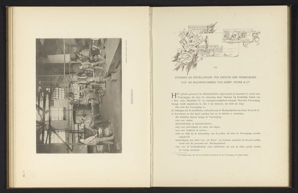 Editor: So, here we have a page from a book. It's titled *Interieur met werknemers van de ketelmakerij van de machinefabriek van Gebroeders Stork & Co*, or "Interior with employees of the boiler factory of the machine factory of Brothers Stork & Co," dating to before 1894. It's a print of a photograph from the Rijksmuseum collection. The image feels… cluttered, industrial. What stands out to you in this piece? Curator: The photographic print carries a significant weight beyond mere documentation. Look at how the figures blend into the machinery; the cultural memory embedded in such images speaks of the Industrial Revolution’s impact. Note the gridded object dominating the foreground – what repeating patterns do you see? Editor: Besides that gridded structure, I see lines and beams everywhere. It's really interesting how the artist has created an image of controlled chaos with his placement. Is there a symbolic component in its composition? Curator: The strong lines can be interpreted as the imposition of order and industry, yet the chaos reflects the human element attempting to control immense technological power. It reflects both human innovation, and potentially its cost. Can you see in this print, in addition to industry, an aspect of continuity? Editor: Hmmm… The boiler factory seems cold, impersonal even though people work there, yet you see a shared undertaking in this place of labor. Their collective endeavor is what makes it hopeful. The image and text in conjunction suggest that this site had a narrative of purpose and connection. Curator: Precisely! It becomes a symbolic landscape where work, industry, and human effort coalesce to forge cultural identity and shared memory. Considering the piece this way really connects past and present.