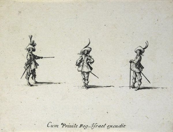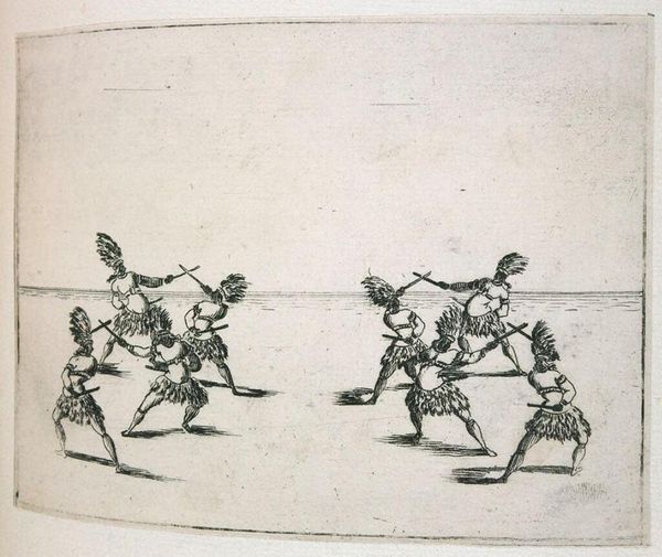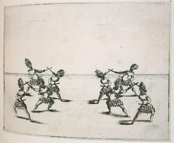 Curator: Here we have Valerio Spada's "Plate II, Four Bear Trainers Sprinkling the Ground, from Ballet of Bears with Parrots, Ballet by Jean Baptiste Balbi for "La Finta Pazza," a miniature etching measuring only about 10 by 14 centimeters. Editor: It's oddly captivating, isn't it? There's a sort of whimsical, almost dreamlike quality to the scene, despite its sparse detail. Curator: Indeed. Spada, active in the 17th century, captures a moment from a larger theatrical spectacle. The watering seems ceremonial, almost ritualistic. Editor: I find myself wondering, what are they watering? Is it symbolic, some kind of cleansing, or simply preparing the stage for the bears and parrots? Curator: Perhaps it's about cultivating the unexpected, or seeding a space where nature and artifice can playfully collide. Editor: Yes, there's something beautifully absurd in the mundane action elevated to performance. I'm glad we took a moment with this peculiar little dance. Curator: As am I. It reminds us that even the most fleeting gestures can hold layers of meaning and intention.