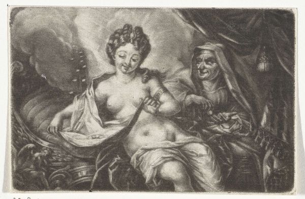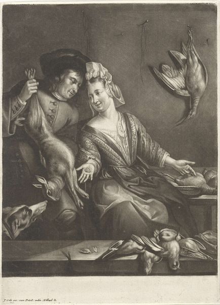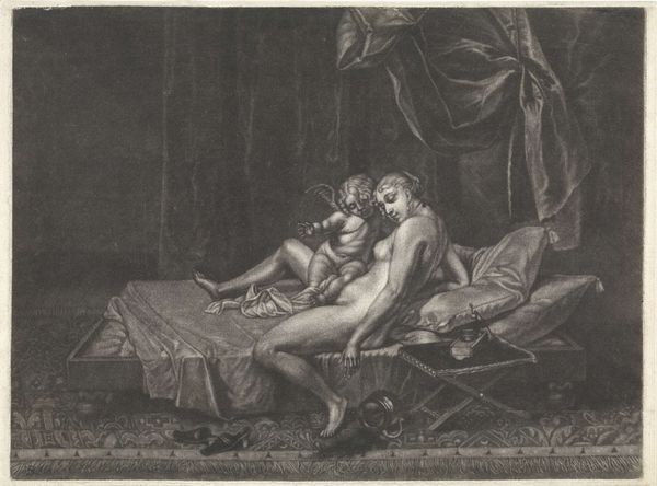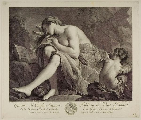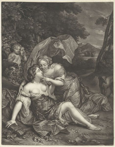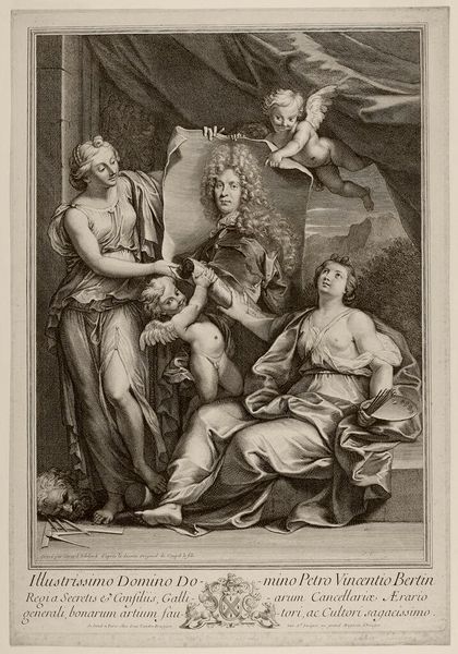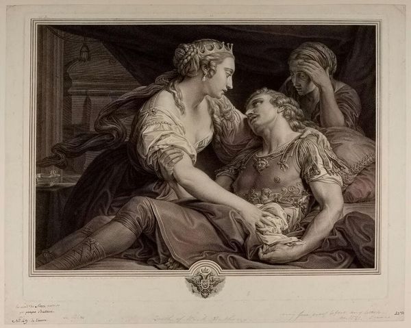 Editor: Pierre Viel's "Peace bringing back Abundance" presents two figures in an intimate embrace. It feels very allegorical. What symbols or meanings stand out to you in this work? Curator: The embrace itself is key. Peace, on the left, brings not just cessation of conflict, but activates Abundance. Notice the wheat she offers, a symbol of prosperity, and the overflowing cornucopia, signifying nature's bounty. Editor: So, it's more than just the end of war; it's a restoration? Curator: Precisely. It speaks to a cycle of renewal, of cultural memory where peace allows for societal flourishing. Think about what "abundance" truly represents to a society after turmoil. Editor: It's interesting how these symbols can carry such weight and hope. I'll definitely think about that. Curator: Indeed, symbols are the visual language of shared understanding.