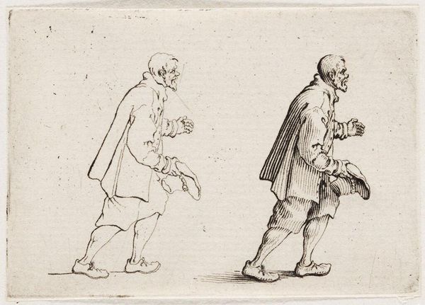 This is an impression of "The Running Man" from "Les Caprices" series, made by an anonymous artist. The print offers an intriguing glimpse into the social dynamics of its time. The figure appears to be caught in a moment of hurried flight, but from what? Is it fear, desperation, or perhaps something more complex driving his frantic escape? The details of his attire hint at a particular social standing, possibly someone caught between worlds, neither fully privileged nor entirely destitute. The fact that the artist is unknown adds another layer of mystery. Was this anonymity a choice, a commentary on the artist's own position within society, or simply a result of historical erasure? This print invites us to reflect on the narratives of those whose stories often go untold, and on the power dynamics that shape both art and history.