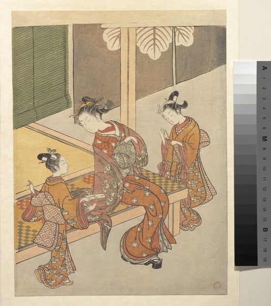 Curator: It strikes me as poised. Even with such limited shading, the figures possess remarkable substance. Editor: Absolutely. And now, let’s turn our attention to a remarkable piece of ukiyo-e art held here at the Metropolitan Museum. Created sometime between 1868 and 1912, this woodblock print by Okumura Masanobu is titled "Three Courtesans and a Kamuro Strolling in the Street". Curator: The economy of line is impressive! Look how just a few curves define the folds of their robes. There's a deliberate elegance to the whole composition. I am just picturing their measured movements. I wonder, were they off duty or on their way to an engagement? Editor: Formally, the work achieves a striking balance through its spatial arrangement. The rhythmic repetition of figures is punctuated by contrasting kimono patterns that lead the eye deeper into the scene. The lines create not just forms, but a clear distinction in societal strata, don’t you think? The narrative it presents really is quite compelling from both perspectives: what’s included in the image versus what the image can reveal to us about history. Curator: You’re right! It's hard to ignore those intricate kimono designs. Almost as if the scene is framed by fashion, don’t you think? Editor: Precisely! Moreover, the careful arrangement subtly reveals nuances in rank through the size and decoration. The bold patterns, juxtaposed against the linear architecture, embody the sophisticated artifice prevalent during the Meiji era. Even with the flatness of a print, a certain visual hierarchy persists. Curator: Oh, definitely. It really goes without saying how each element speaks of cultural codes. Each element enhances its richness. Thinking about it, even with that implied hierarchy you’ve so eloquently addressed, there's an underlying sense of mystery in the composition. A feeling of peering into another world, or even their day to day lives… Don't you find this to be an evocative work, indeed? Editor: Indeed! A fleeting glimpse, frozen in ink and wood, revealing both the surface and, perhaps, the secrets beneath. A powerful dialogue in design!