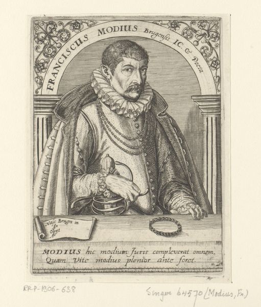 This is Pieter de Jode the Younger’s portrait of Charles IX of France, made with engraving. Notice the subject framed within an architectural structure that's reminiscent of a window or a niche. This framing divides the composition into distinct planes, creating depth and directing our gaze toward the figure of the king. De Jode uses detailed line work to render textures and patterns, from the delicate lace collar to the sumptuous fabrics and the intricate details of the crown. These elements serve not only to depict material wealth but also to reinforce the king's status. The visual language speaks to a larger cultural discourse about power and representation. The sharp, precise lines and the careful rendering of detail convey a sense of order and control. The portrait’s formal qualities act as signs within a semiotic system. It invites us to decode its visual components and consider the cultural codes that would have informed its making and reception.