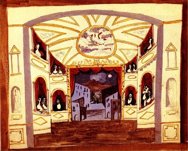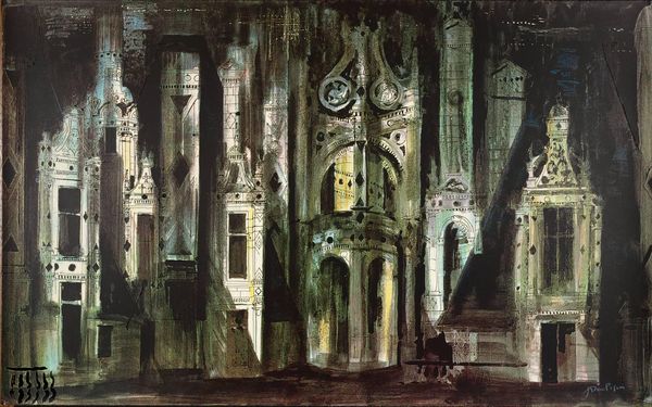 Esteban Frances made this design for a stage set with watercolor, and it’s like he's inviting us into a dream. The overall mauve-y purple feels both eerie and opulent, doesn’t it? The paint is thin, almost transparent, like a memory fading at the edges. Frances focuses on the vertical lines of the architecture, offset by the flickering candles. Notice how he repeats the archways, creating echoes within the space. This rhythm gives the image a sense of depth, but also of being slightly off-kilter. The candles feel so vulnerable against the scale of the arches. They give warmth to the piece, but it's a warmth that’s easily extinguished. It reminds me of Piranesi’s etchings, all these grand, theatrical spaces that hint at something epic, but ultimately suggest a kind of melancholic emptiness. It leaves you wondering what stories this stage could tell.