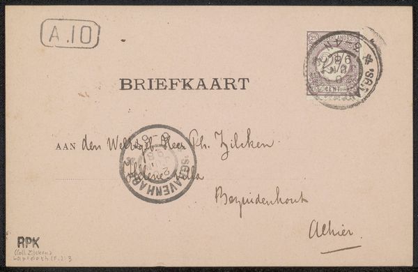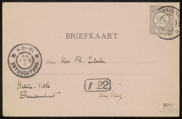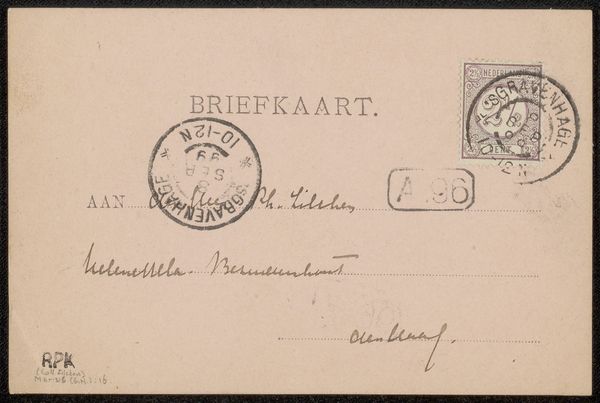 Editor: This is "Briefkaart aan Philip Zilcken," a pen drawing on paper by Willem de Zwart, created before 1899. It's literally a postcard. I find it interesting for its lack of traditional artistic imagery. What’s there to appreciate beyond its historical function? Curator: It’s fascinating how mundane objects become imbued with significance over time. This postcard, seemingly simple, acts as a visual echo of a bygone era, holding multiple layers of coded meaning for the sender and receiver, perhaps even unconsciously. The postal stamps, the stylized handwriting – what do they evoke for you? Editor: Well, the stamps and the handwriting make it feel very personal and intimate, as if I'm glimpsing a private moment in the past. But I'm unsure how to go beyond this. Curator: Consider the very act of sending a postcard in that era. Before telephones were ubiquitous, this was a primary means of quick communication. What symbols of connection and distance might be at play here? What's conveyed by handwriting versus print? Look closely. The address itself: "Kunty Ohil den, Begijnderkout," and then "Den Haag" underneath, does it suggest anything to you? Is there anything familiar there? Editor: Ah, it feels local and quaint – names, stamps and the Dutch words evoke a strong sense of place. I suppose that place *is* the main image here. I guess a postcard, an image you send to someone, almost represents your culture, writ small. Curator: Precisely. The choice of script, the style of the address – all point to a specific cultural and social context, speaking volumes about the relationship between the sender and the receiver. Even the stamps – government-sanctioned images - become signifiers of national identity and civic life. This little scrap of paper is full of meaning, isn't it? Editor: Yes, it is! I had never considered how much information is conveyed through something so commonplace. It shows that the act of communication itself, its symbols and materiality, can become an art form.
